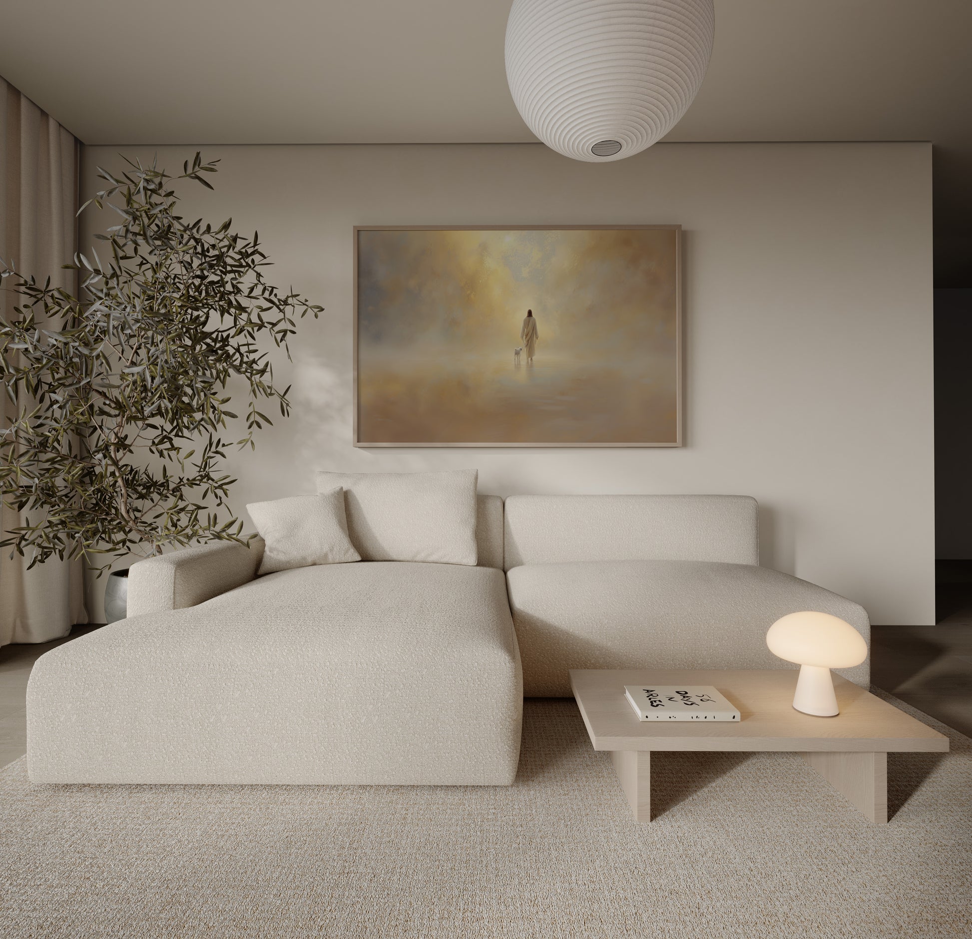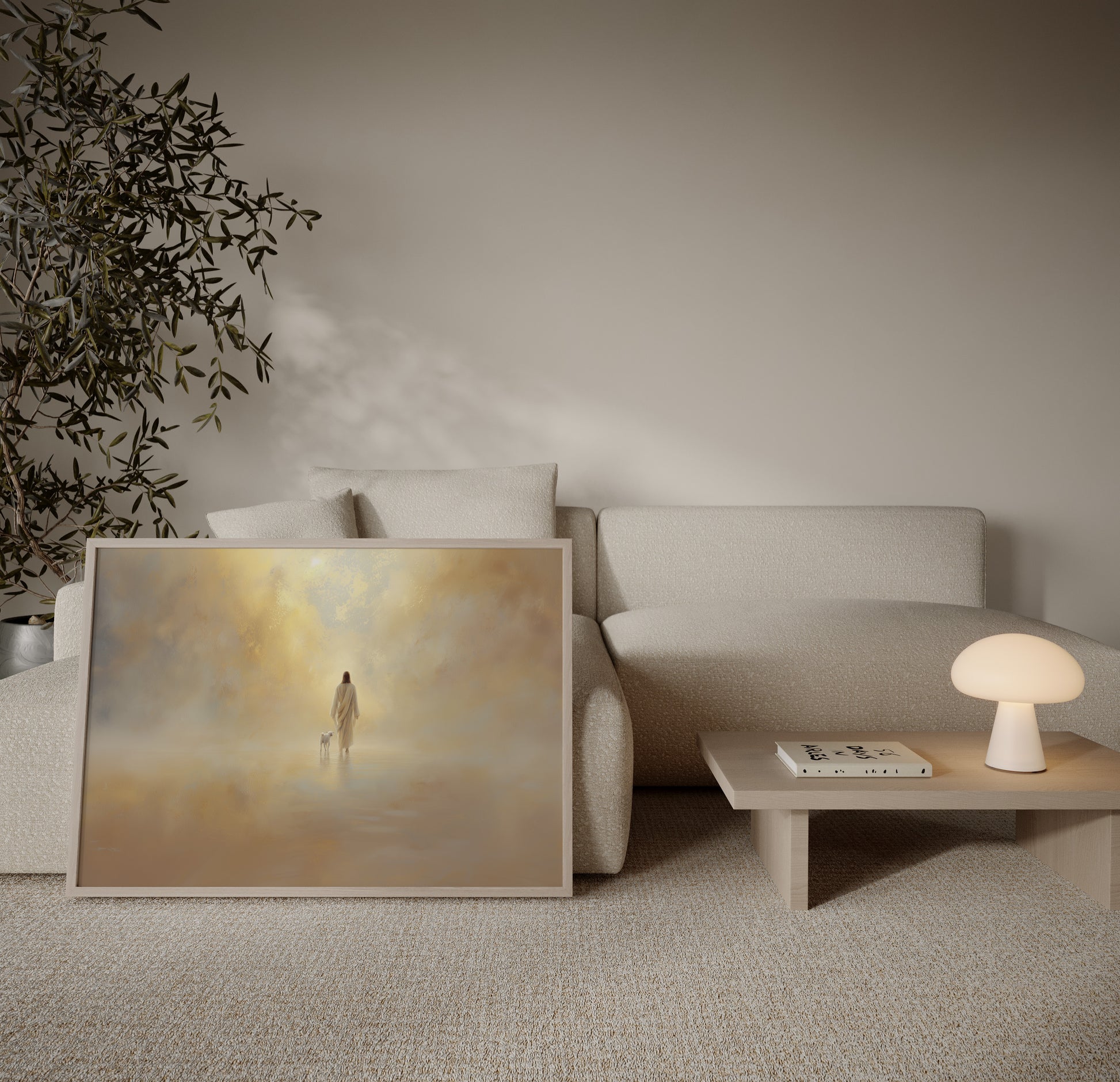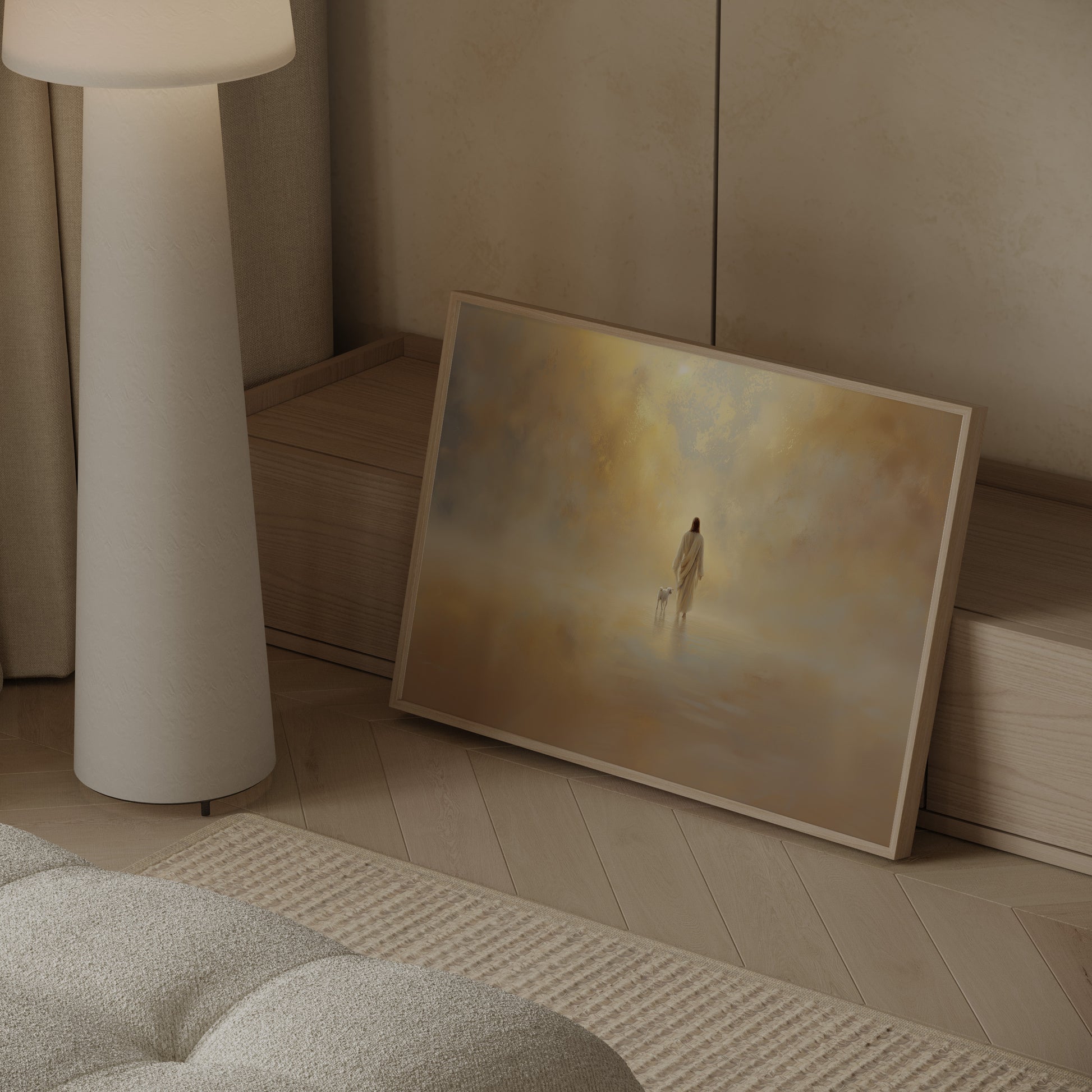 Divine Guidance portrays Jesus beside a lamb, bathed in soft gold and white light, radiating peace, love, and protection. This artwork emphasizes His tender care for every heart that follows Him.