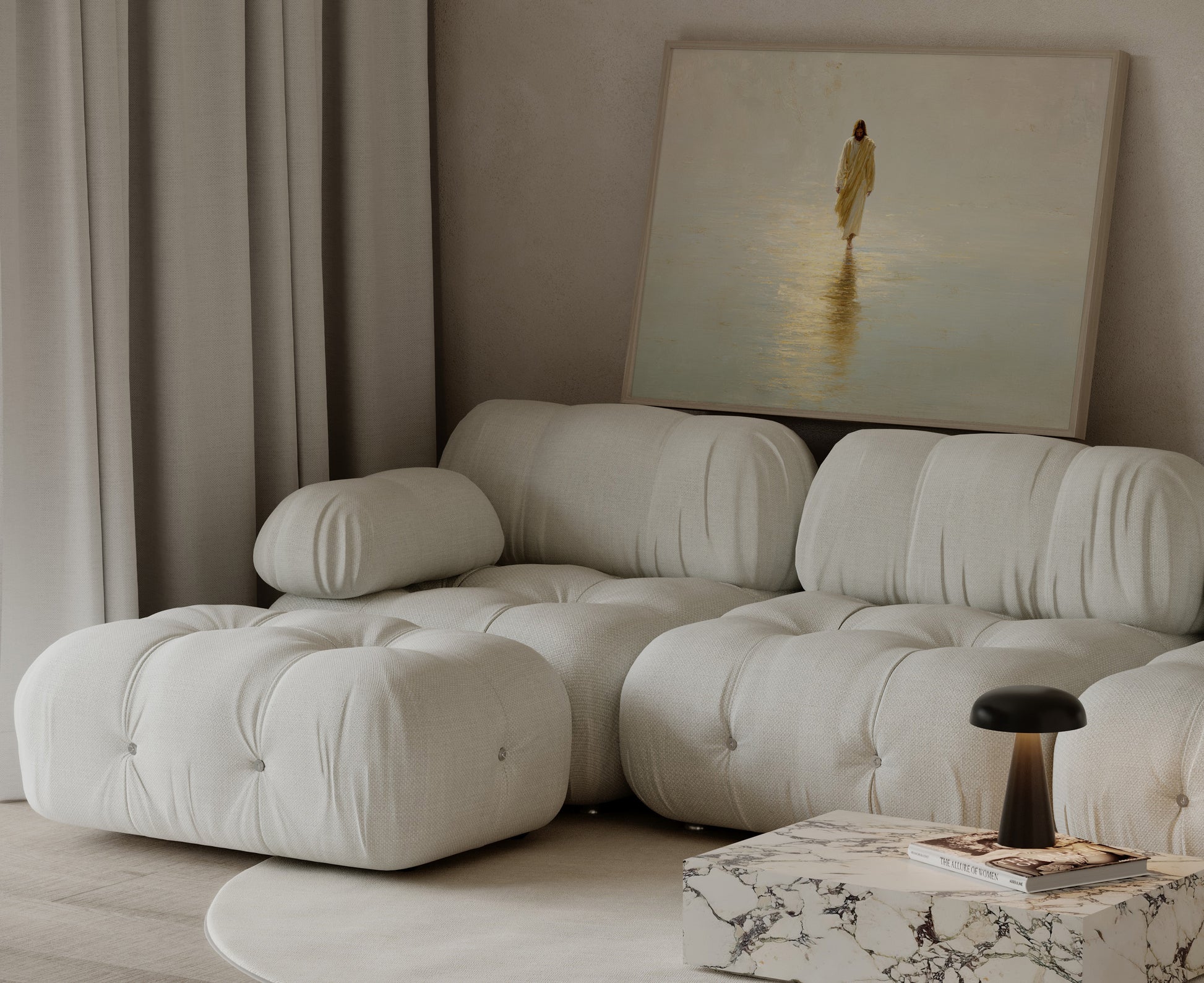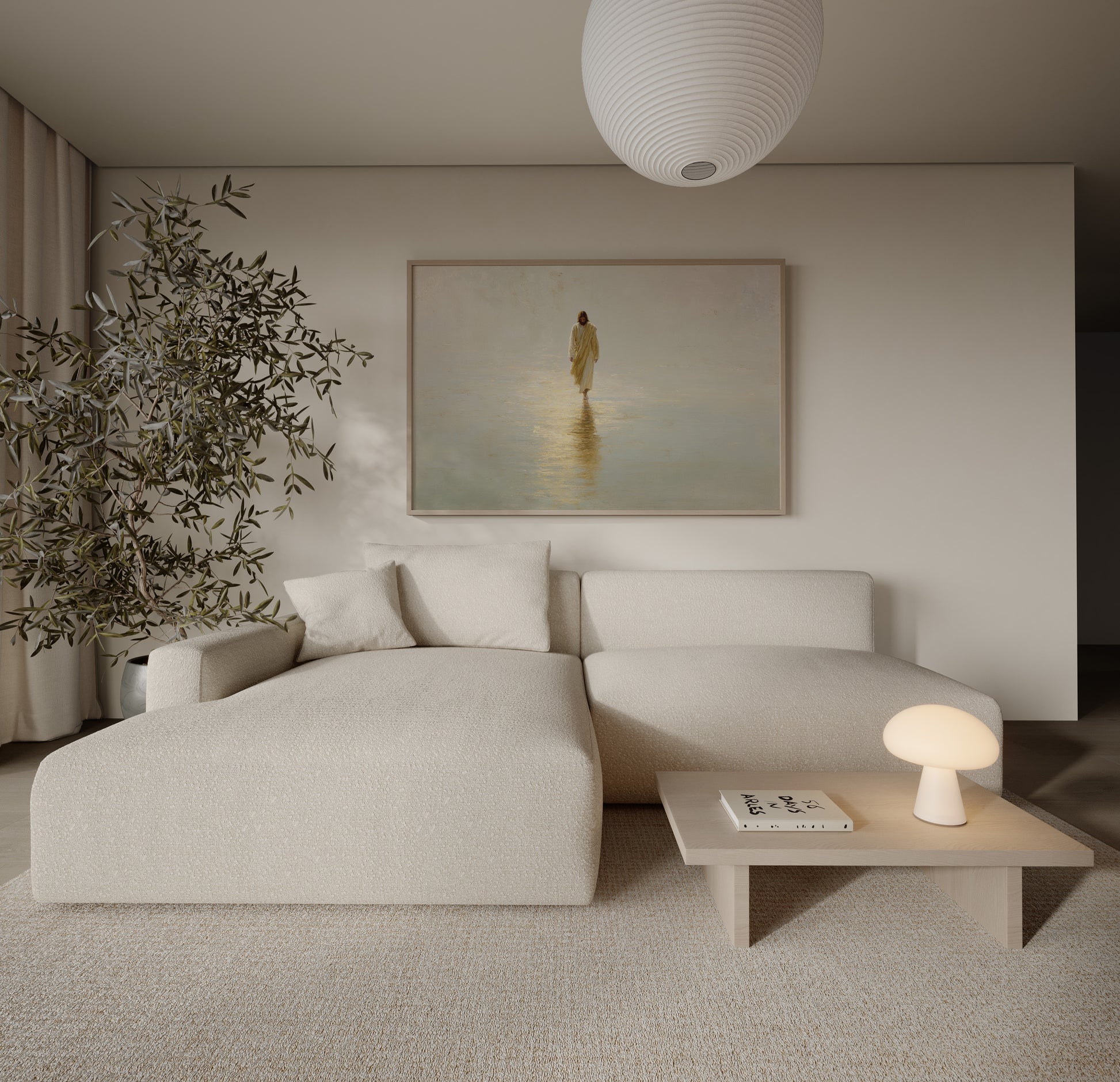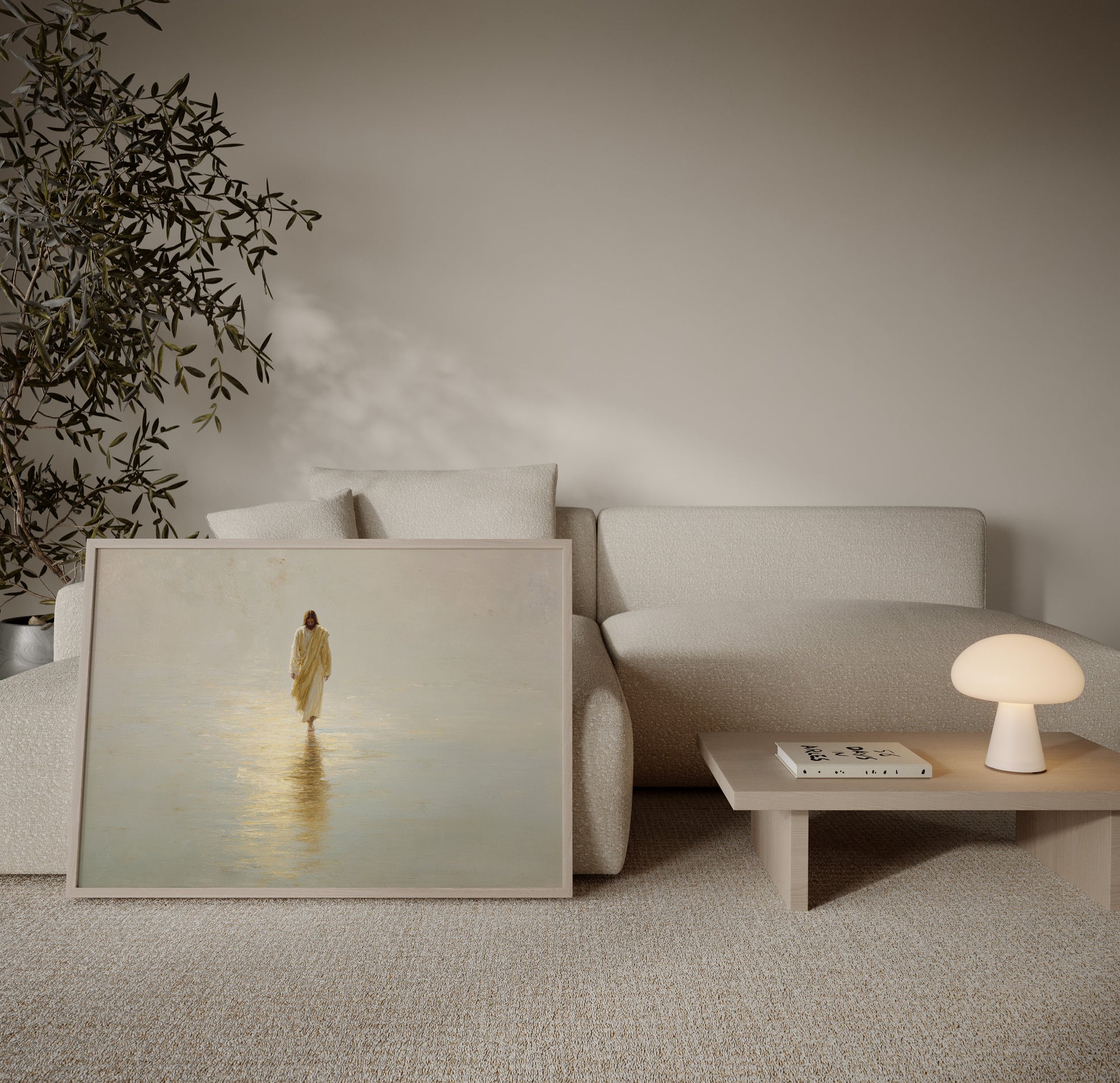 Faith Above the Waves depicts Jesus calmly walking on the water, inviting viewers to trust Him above all fears and uncertainties.