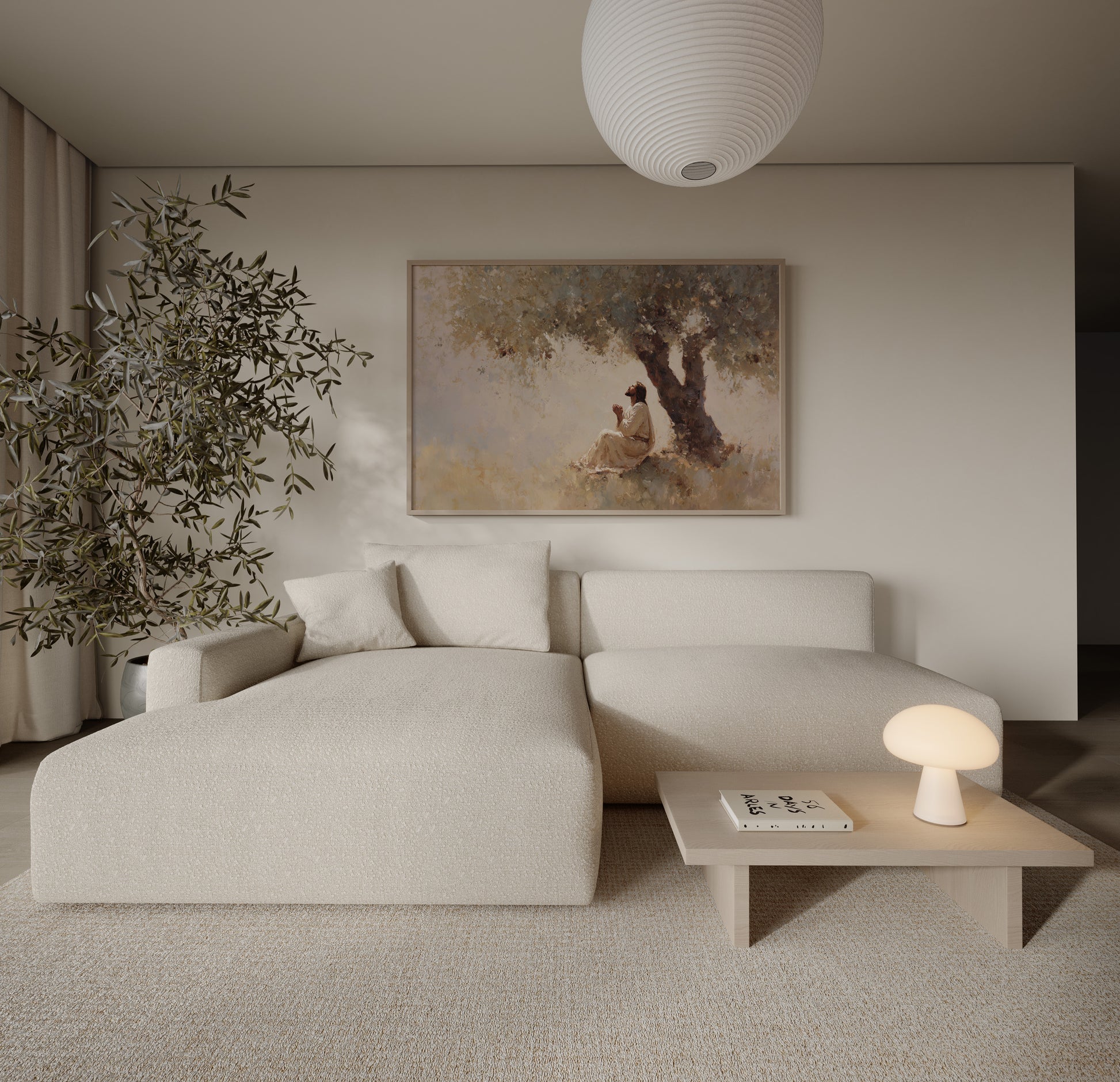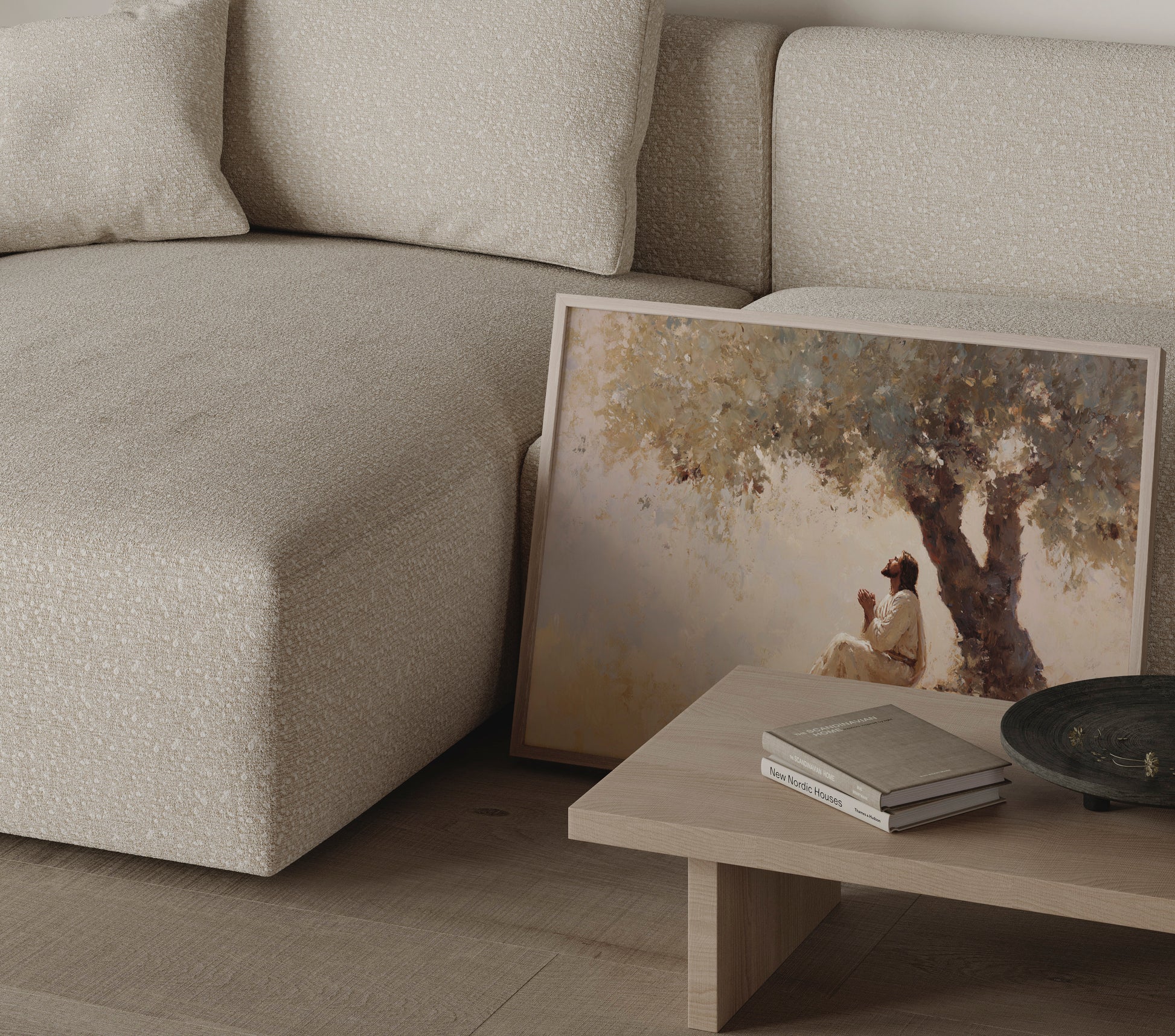 Guided by Prayer depicts Jesus kneeling beneath a majestic tree, lifting His heart in quiet prayer. The serene scene symbolizes devotion, surrender, and the guidance that comes from seeking God in moments of stillness.