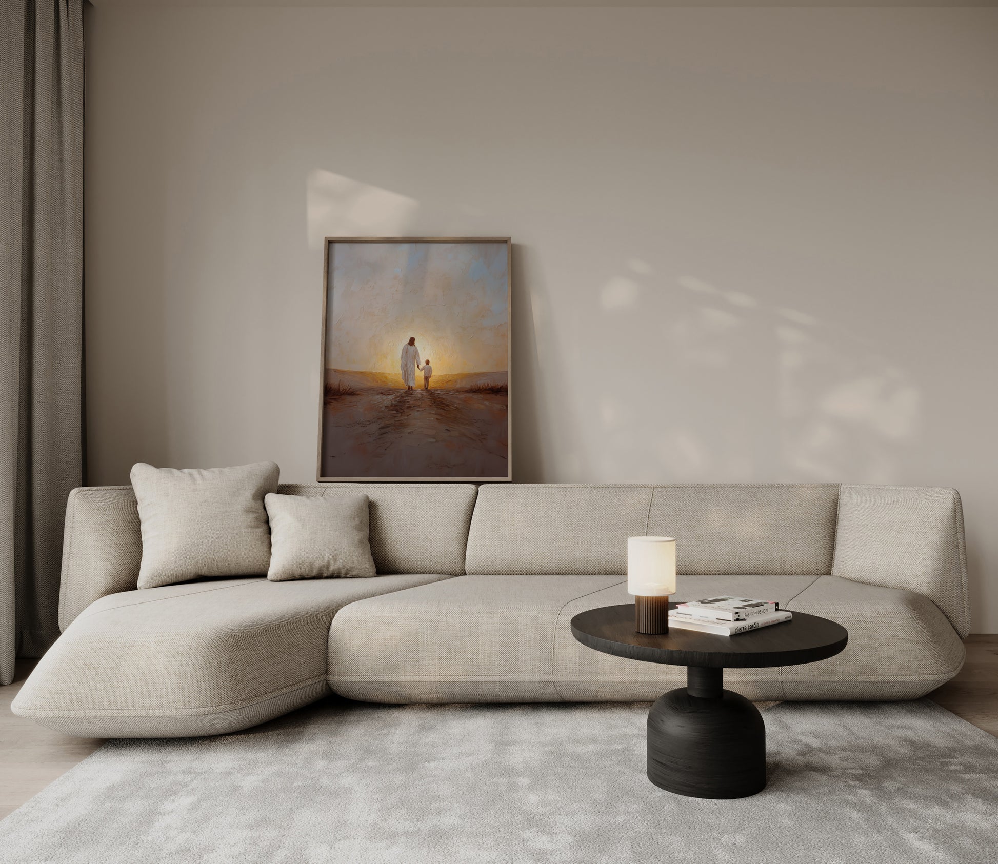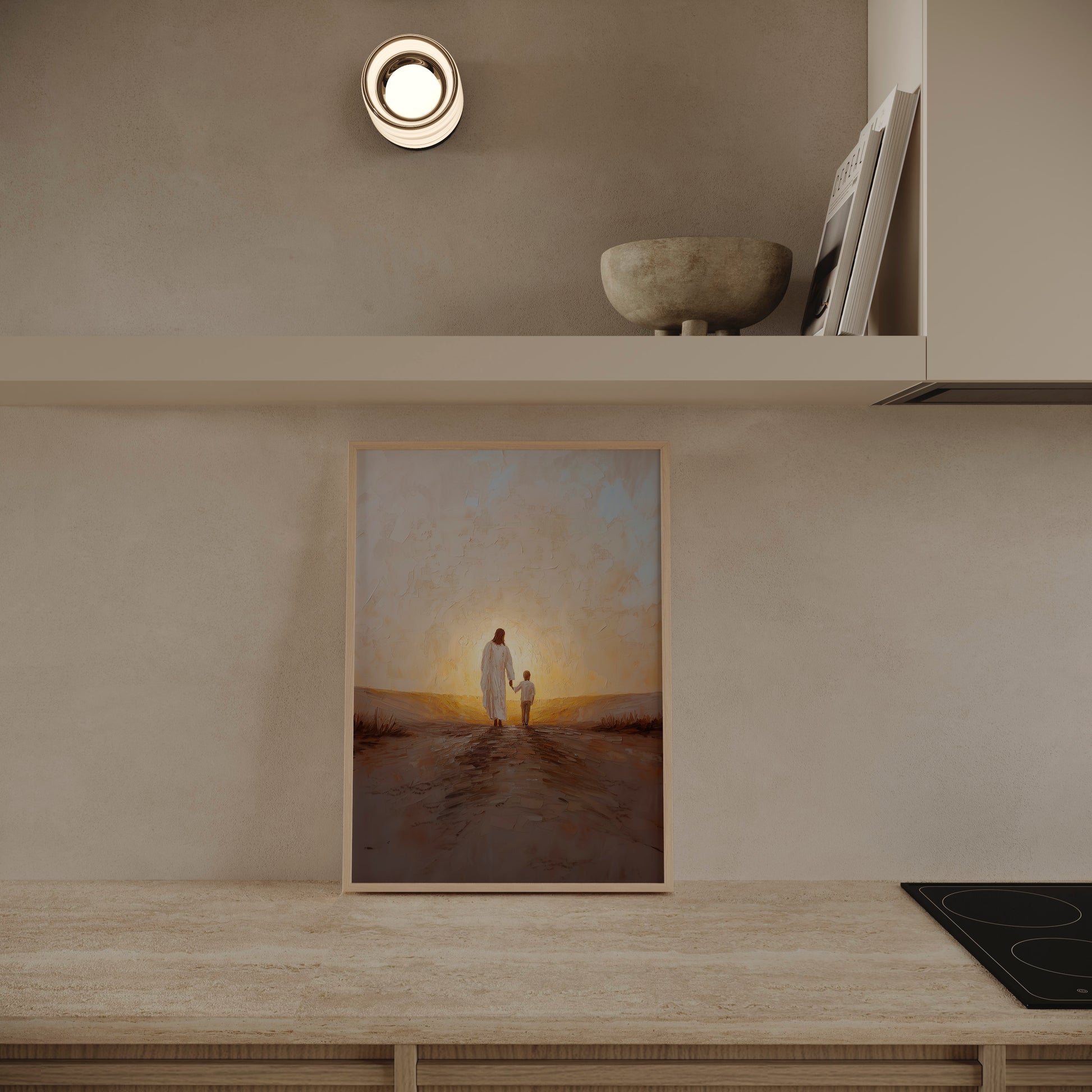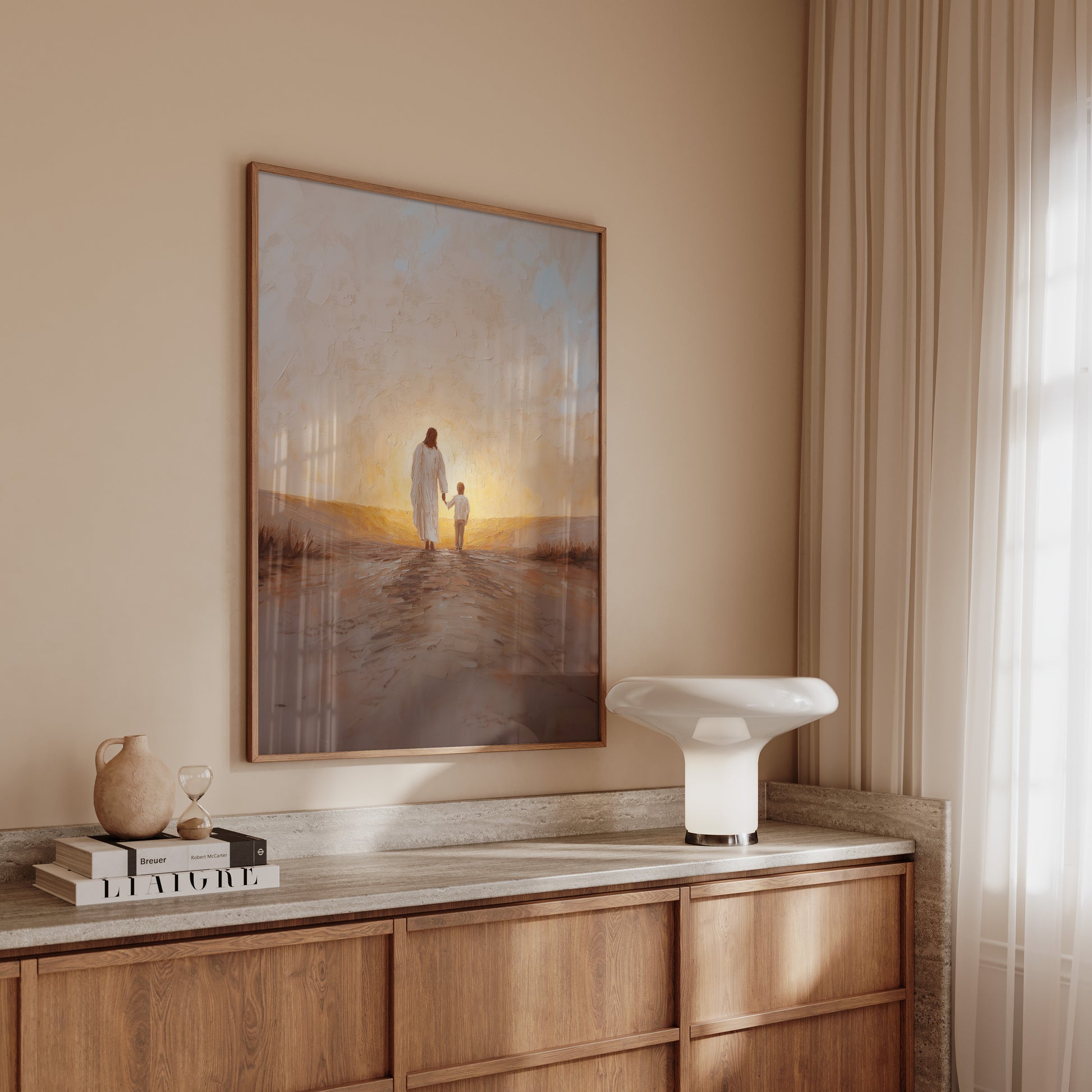 The Gentle Guide captures Jesus walking hand in hand with a child, a symbol of His loving guidance through every season of life. With each step, this artwork reflects His promise to never leave us, leading us with kindness, protection, and unwavering love.