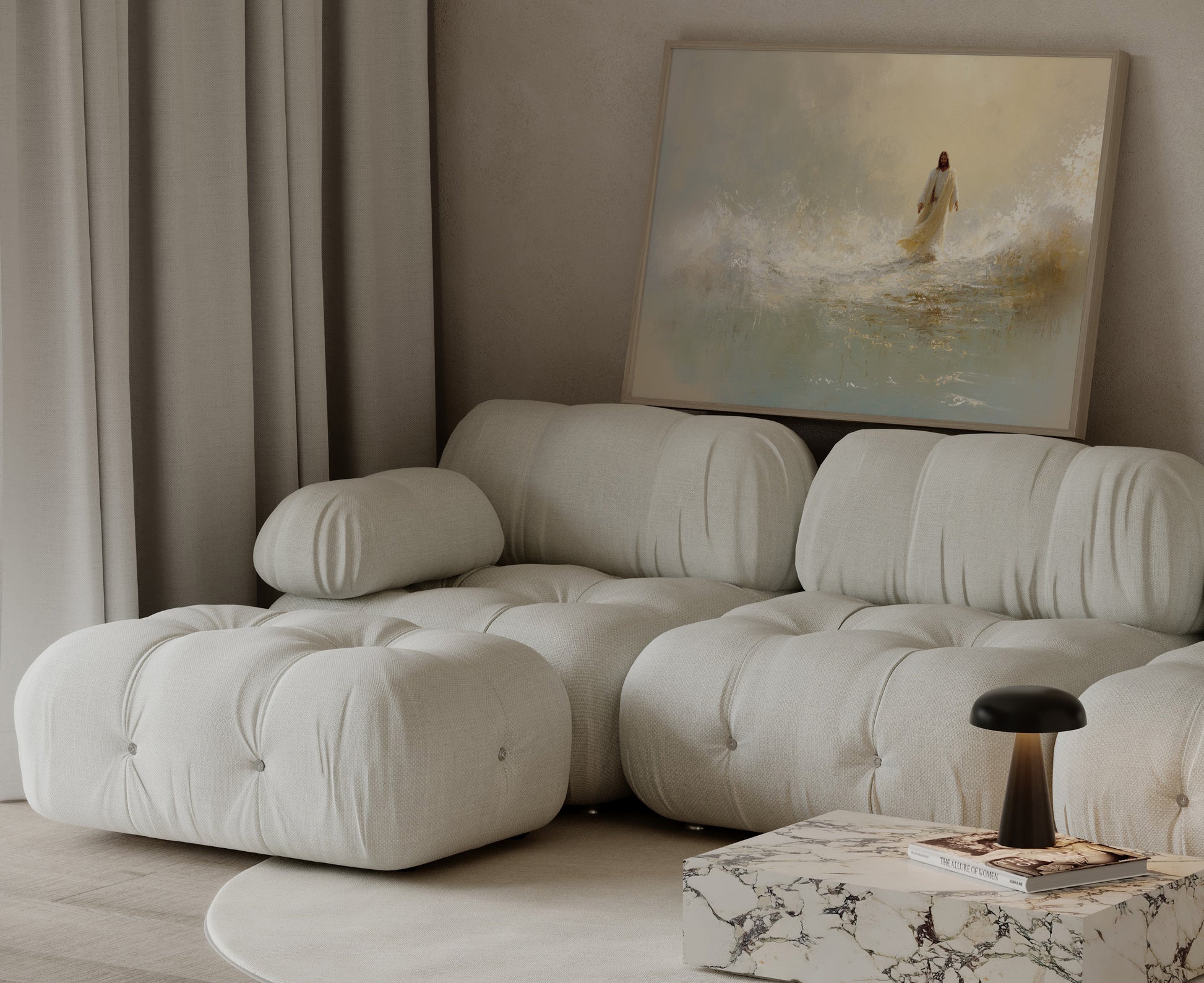 Messiah of the Sea portrays Jesus walking serenely over waves, showing His control over creation and His care for all who trust Him.