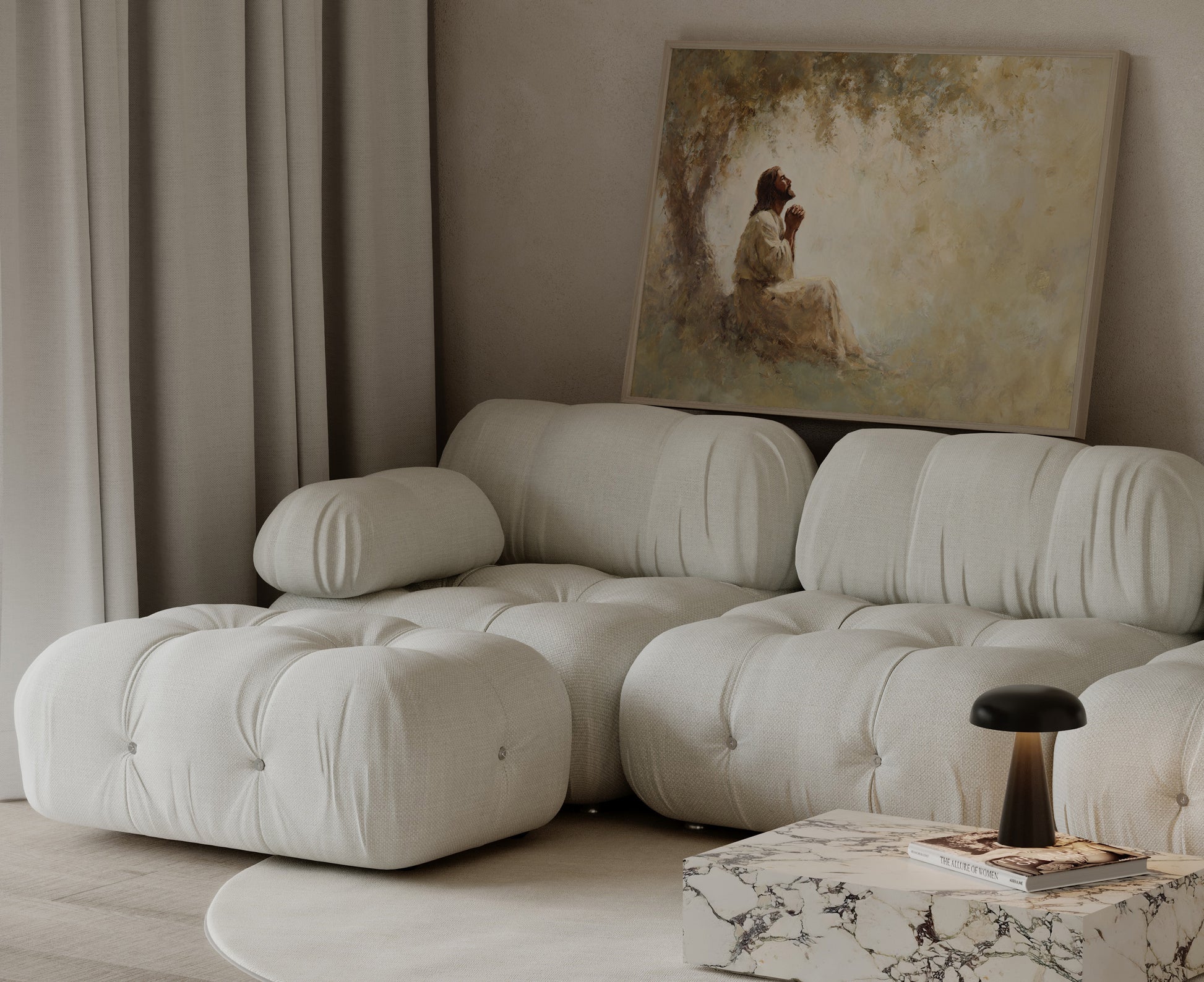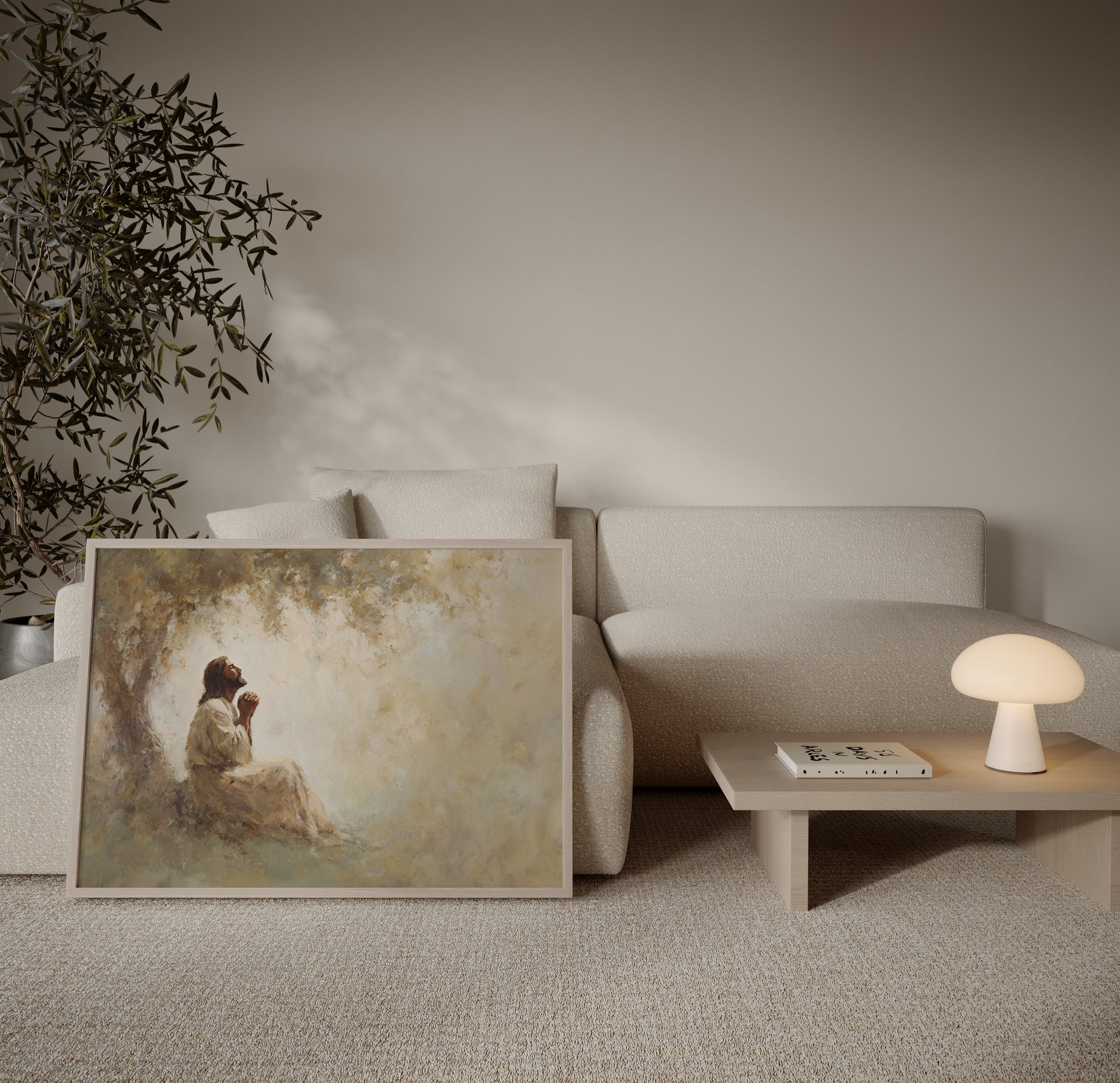 Seeking the Father depicts Jesus kneeling beneath a serene tree, deeply immersed in prayer and reflection. The peaceful setting symbolizes His devotion, humility, and the intimate connection He shares with God.