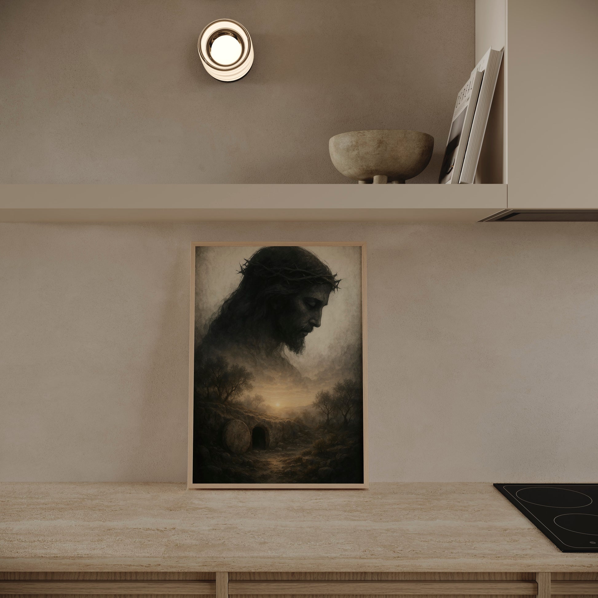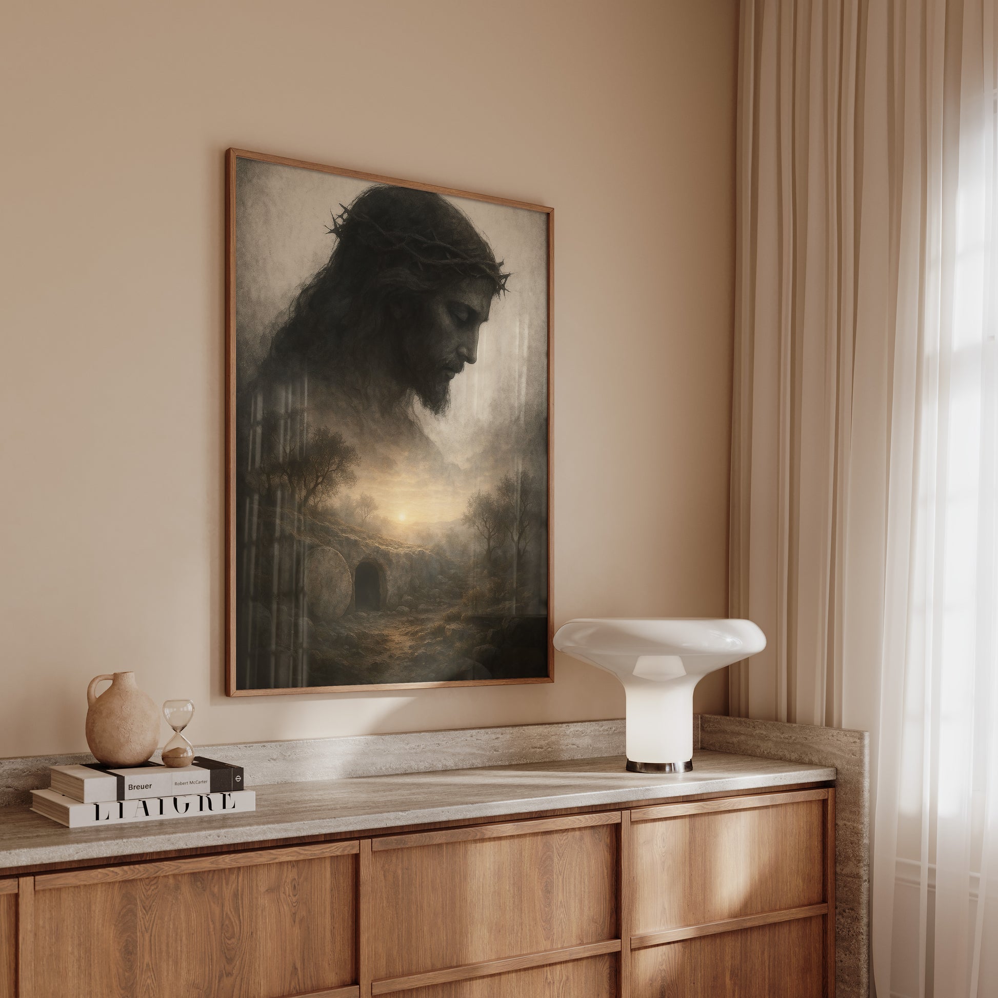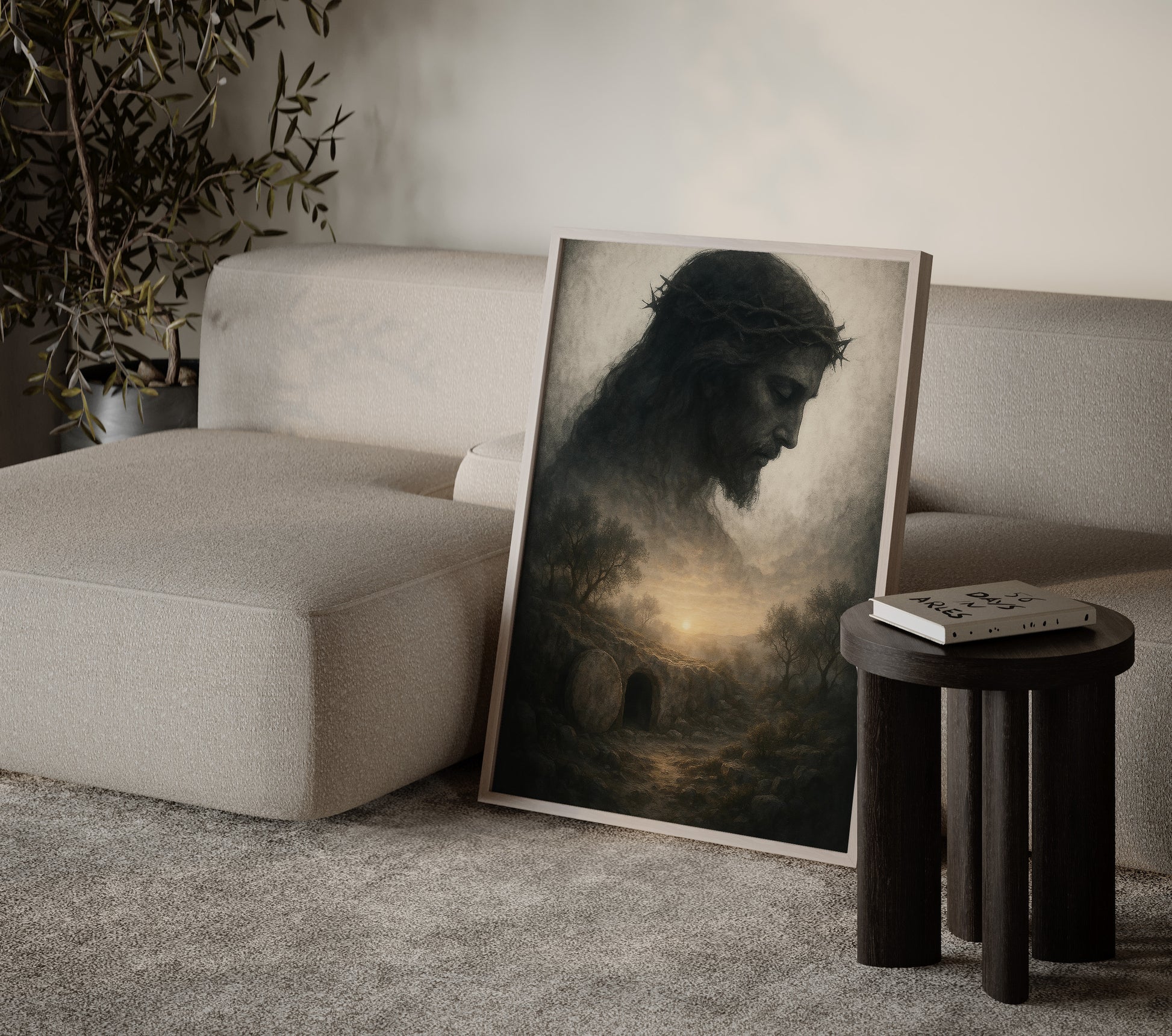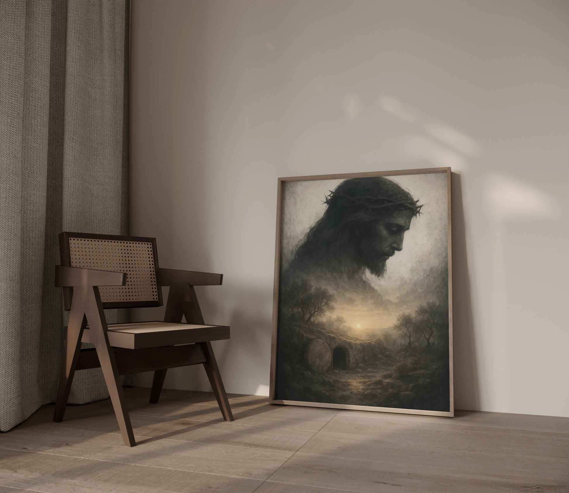 The Cave of Sorrows shows Jesus gazing at the tomb with sadness and solemn reverence. His expression reflects the depth of His sacrifice, the burden of sin He carried, and the love that led Him here.