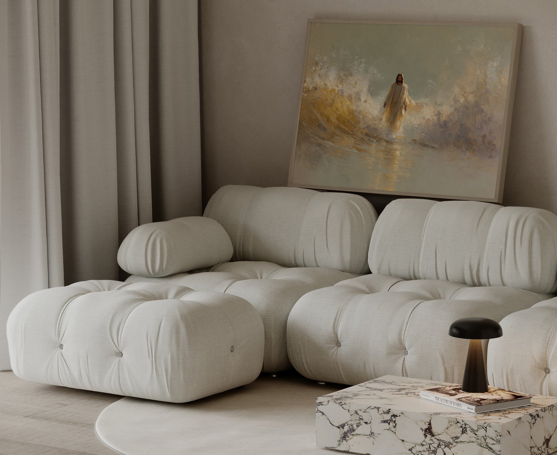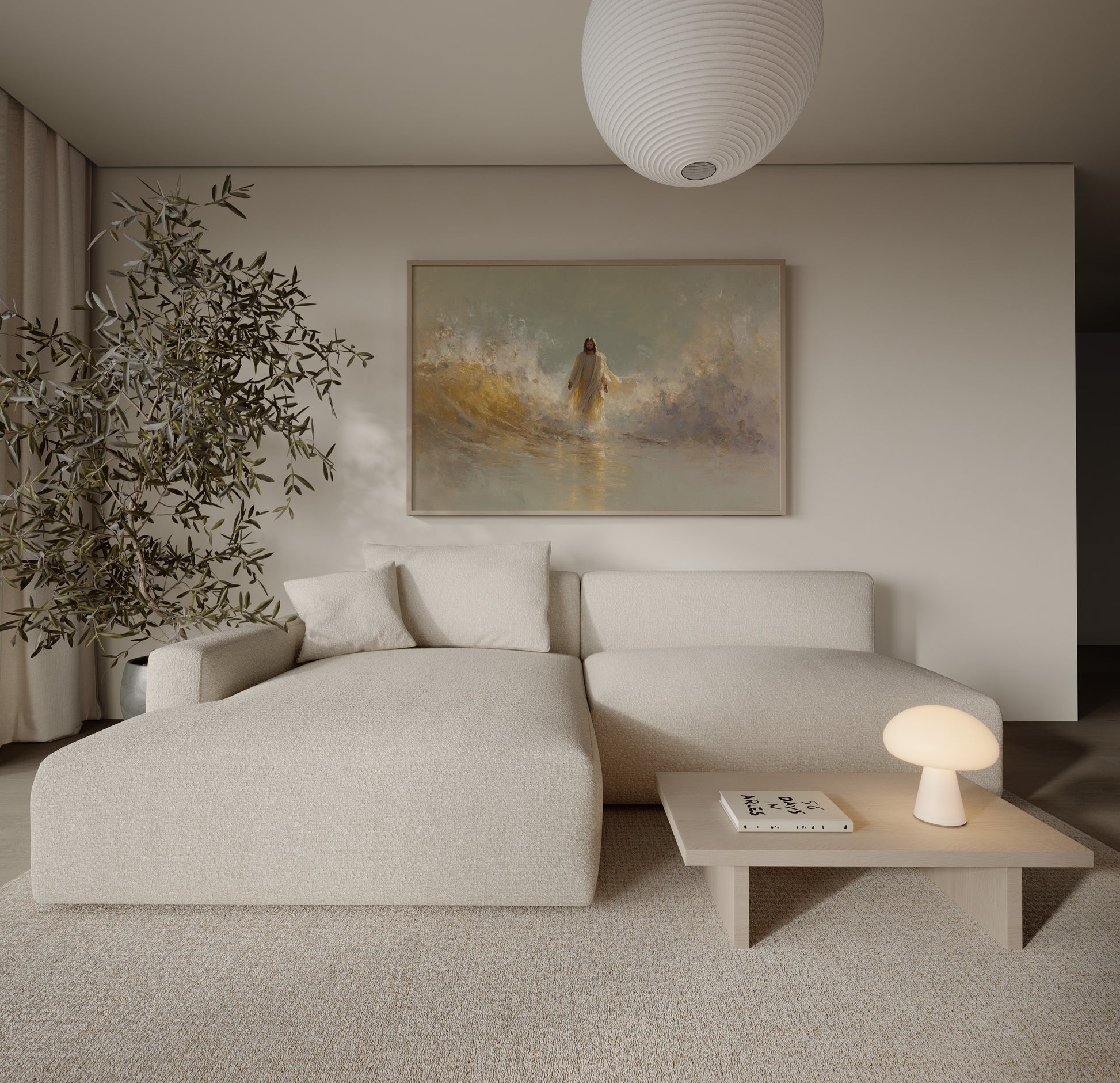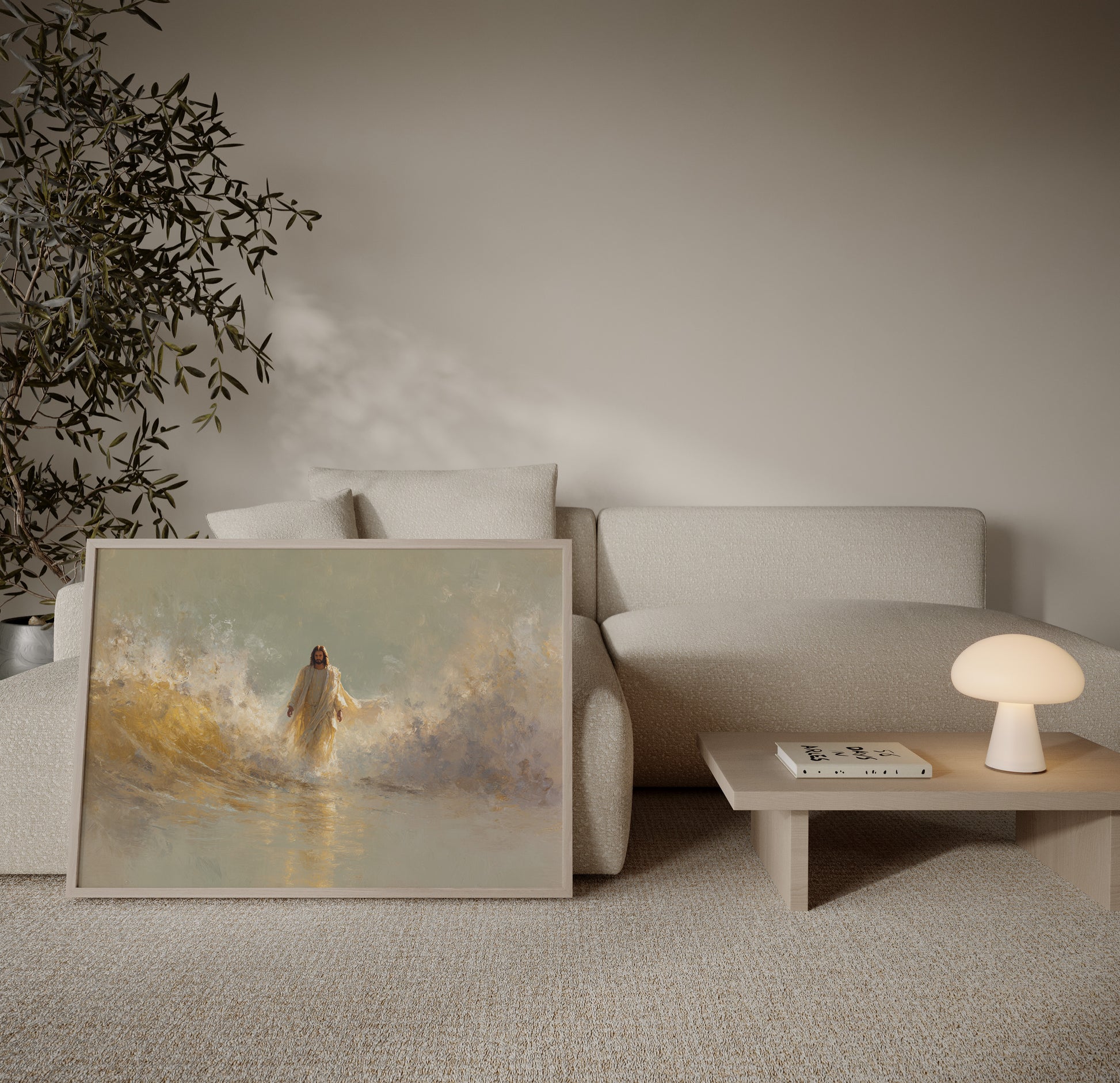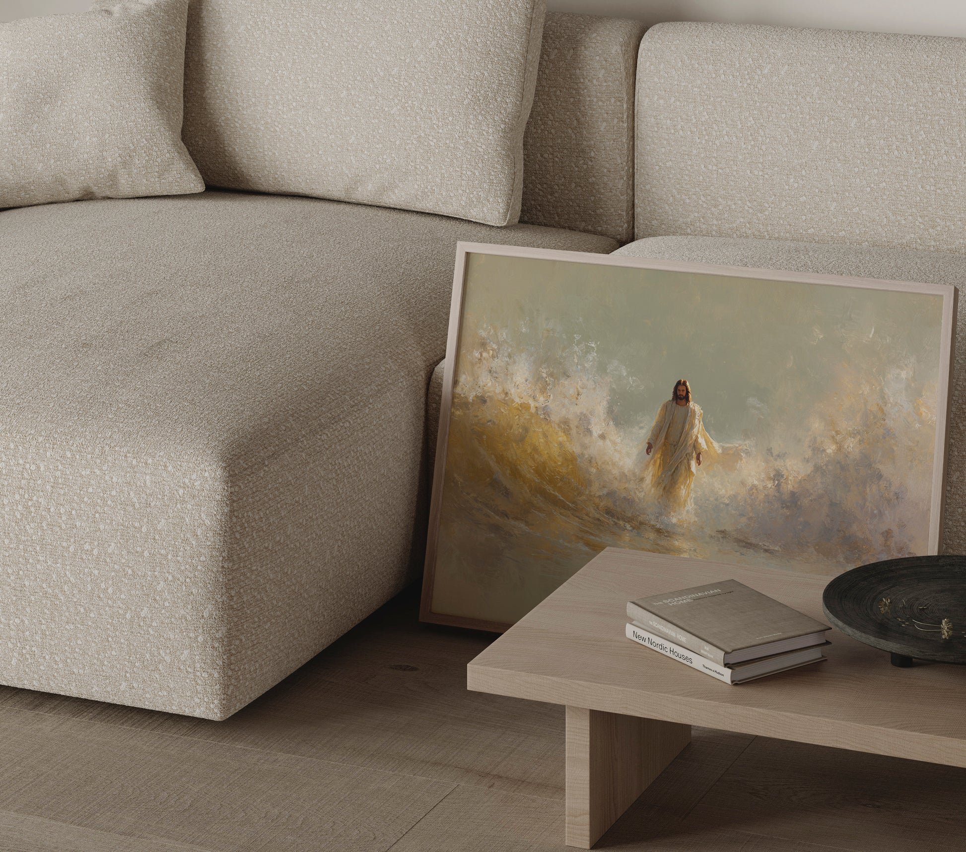 The Lord of the Sea shows Jesus commanding the waves with authority, a vivid reminder of His divinity and protective care over all creation.