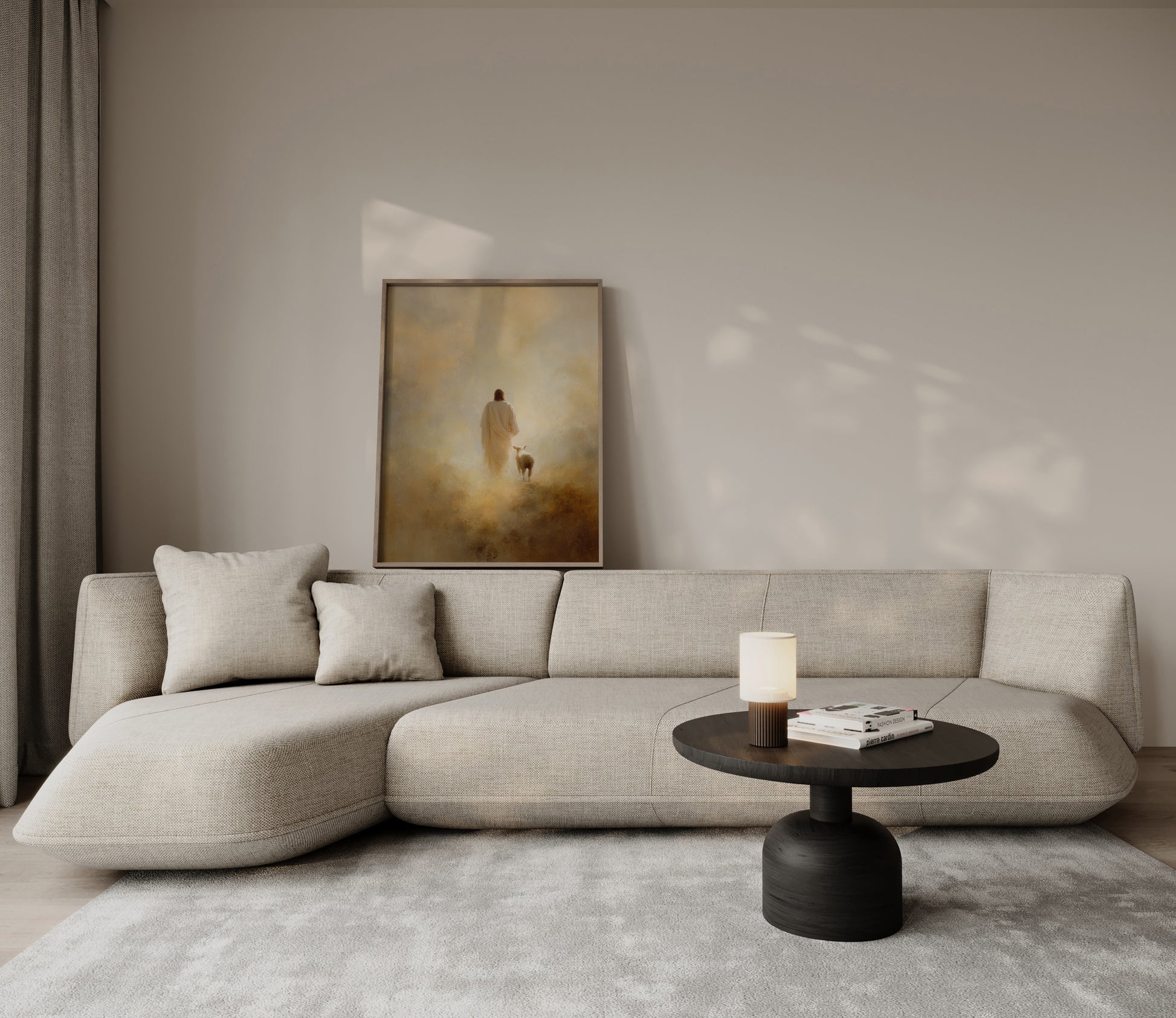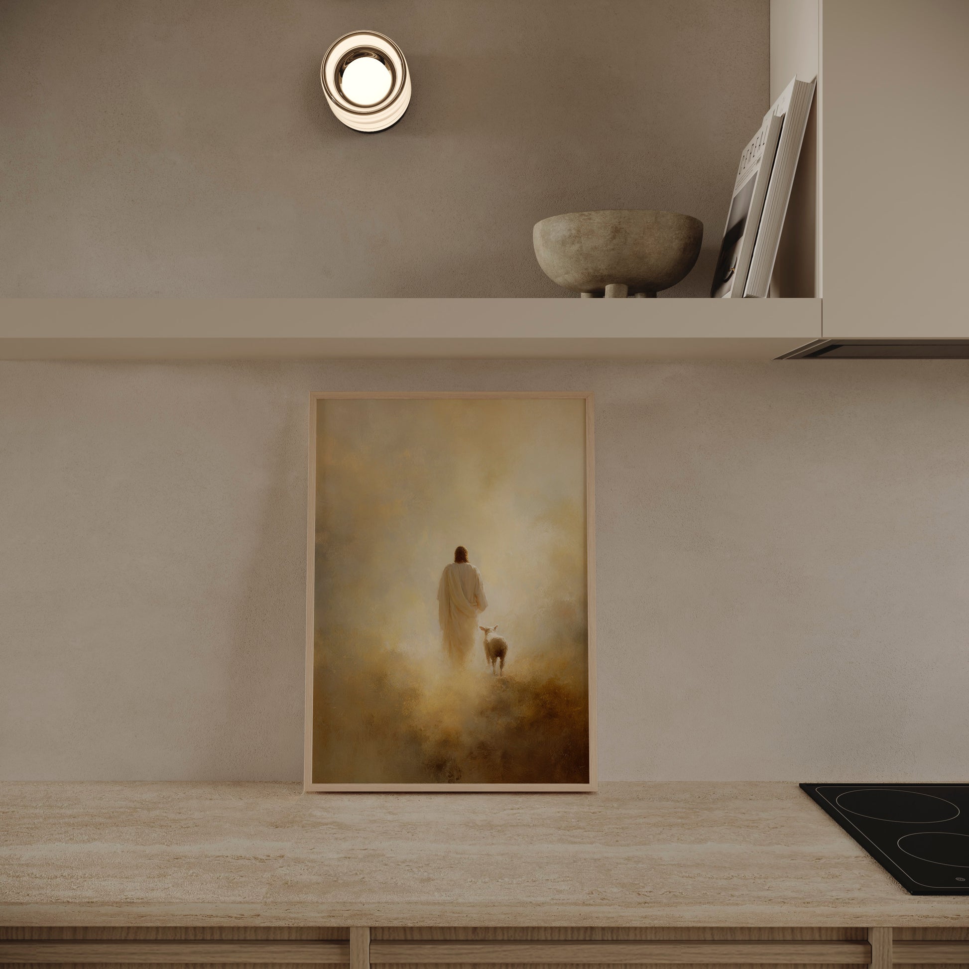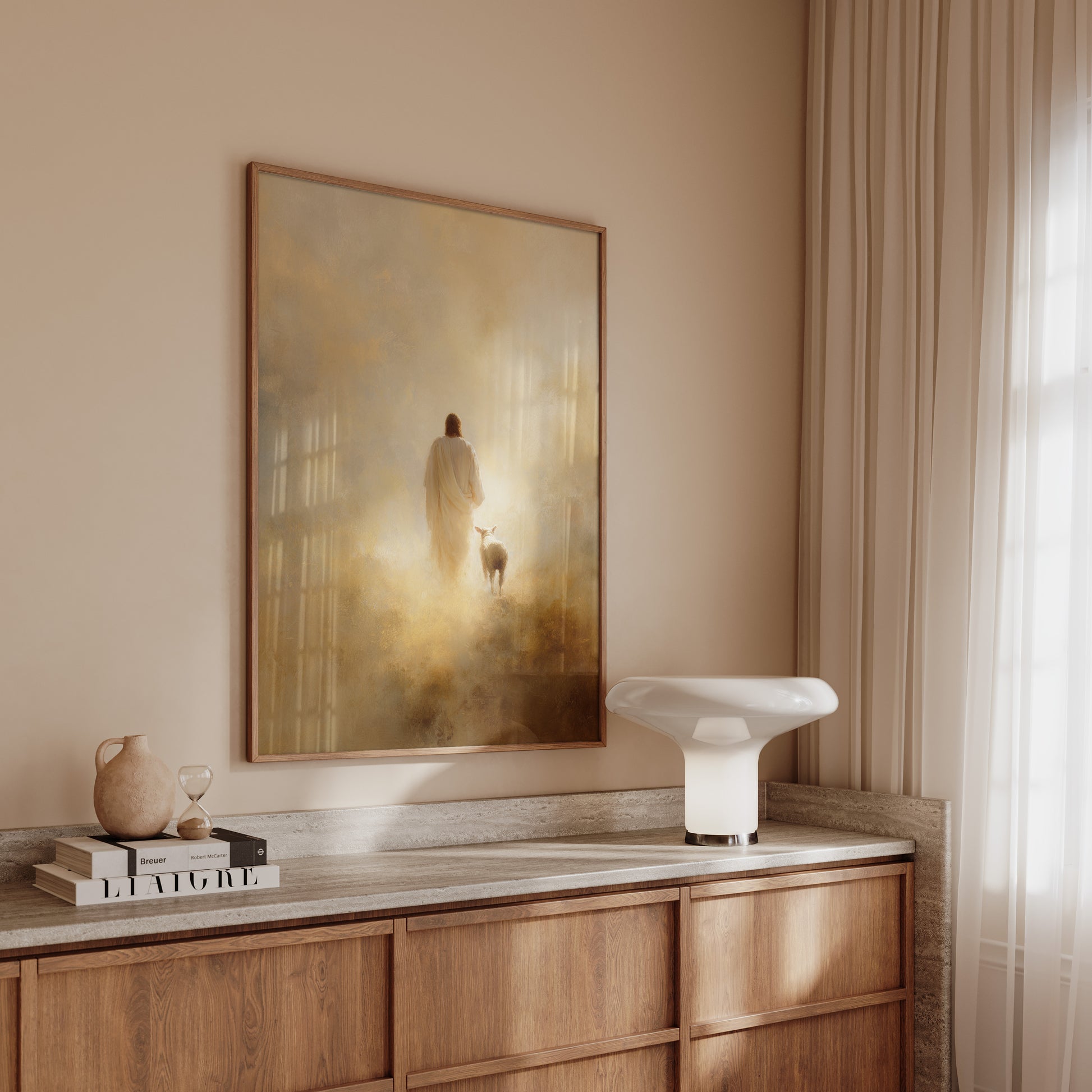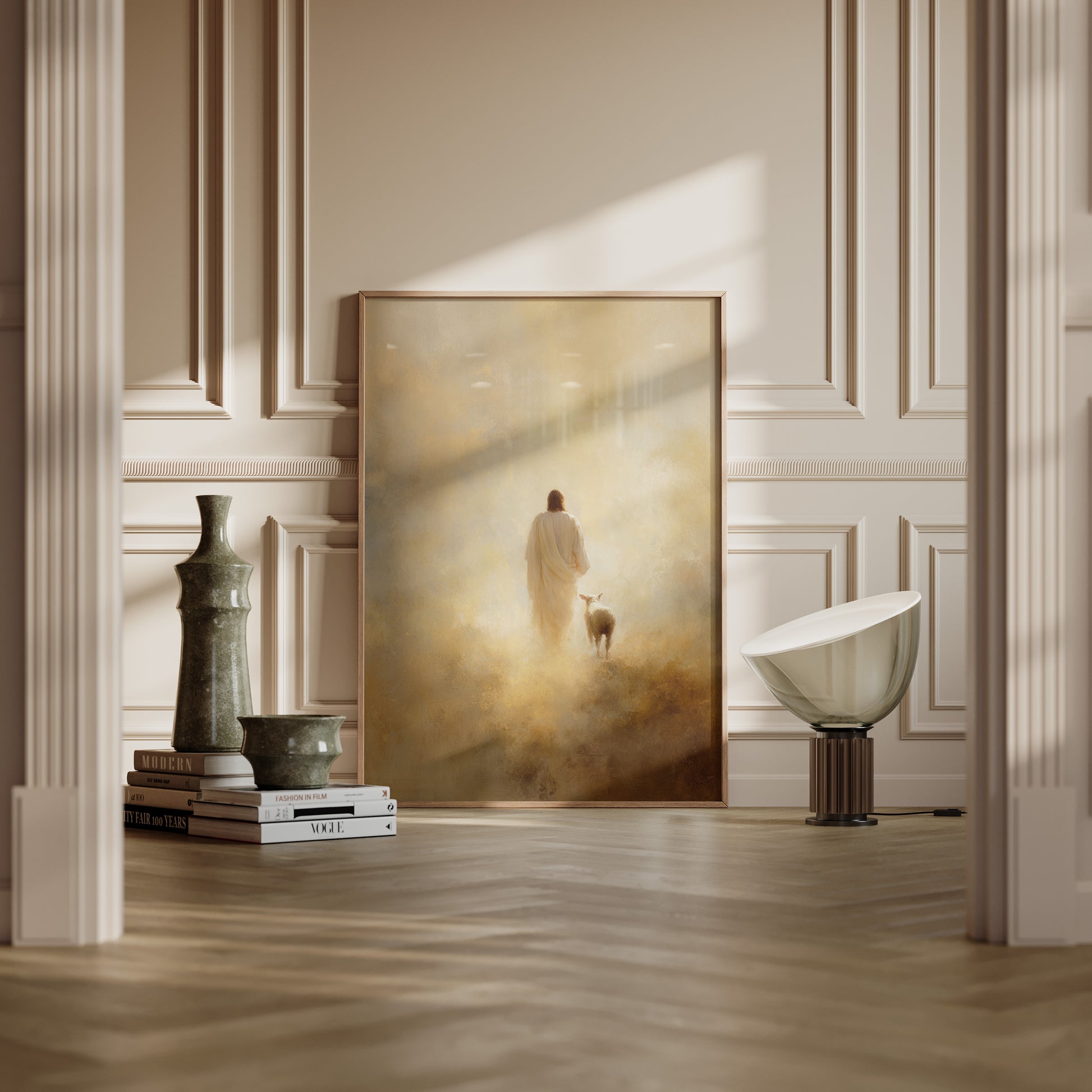 The Lost and Found shows Jesus walking beside a lone lamb, leaving the ninety-nine, bathed in radiant golden light. The scene embodies His pursuit of the lost, compassion, and eternal care.