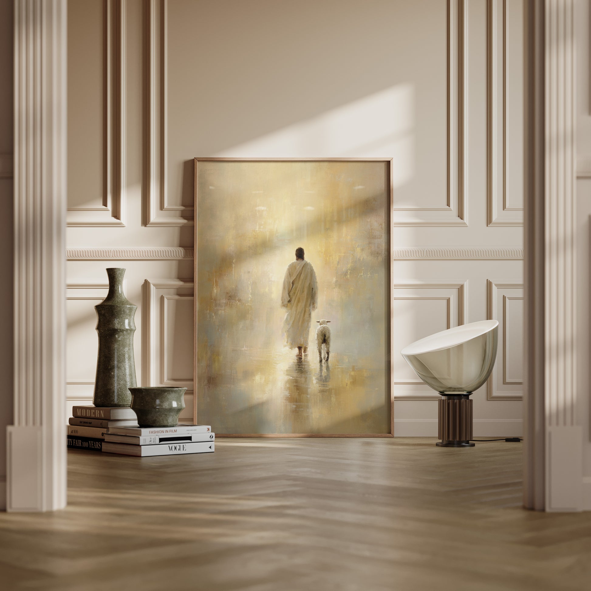 The Shepherd’s Light depicts Jesus beside a single lamb, leaving the 99, with a warm golden glow highlighting His compassion and the joy of seeking the lost.