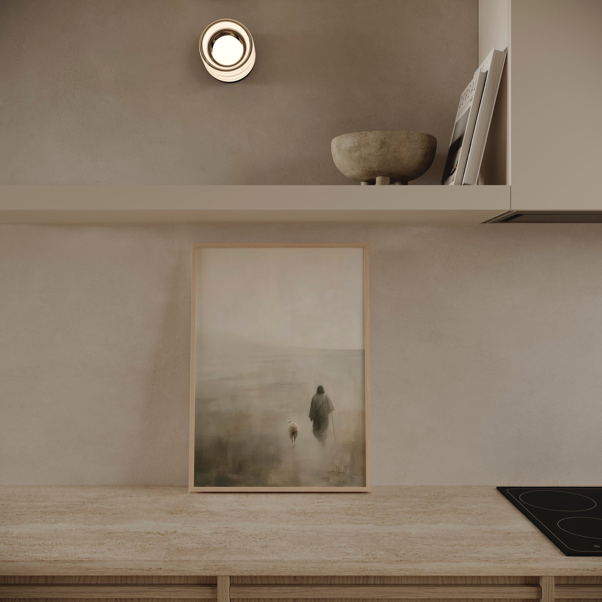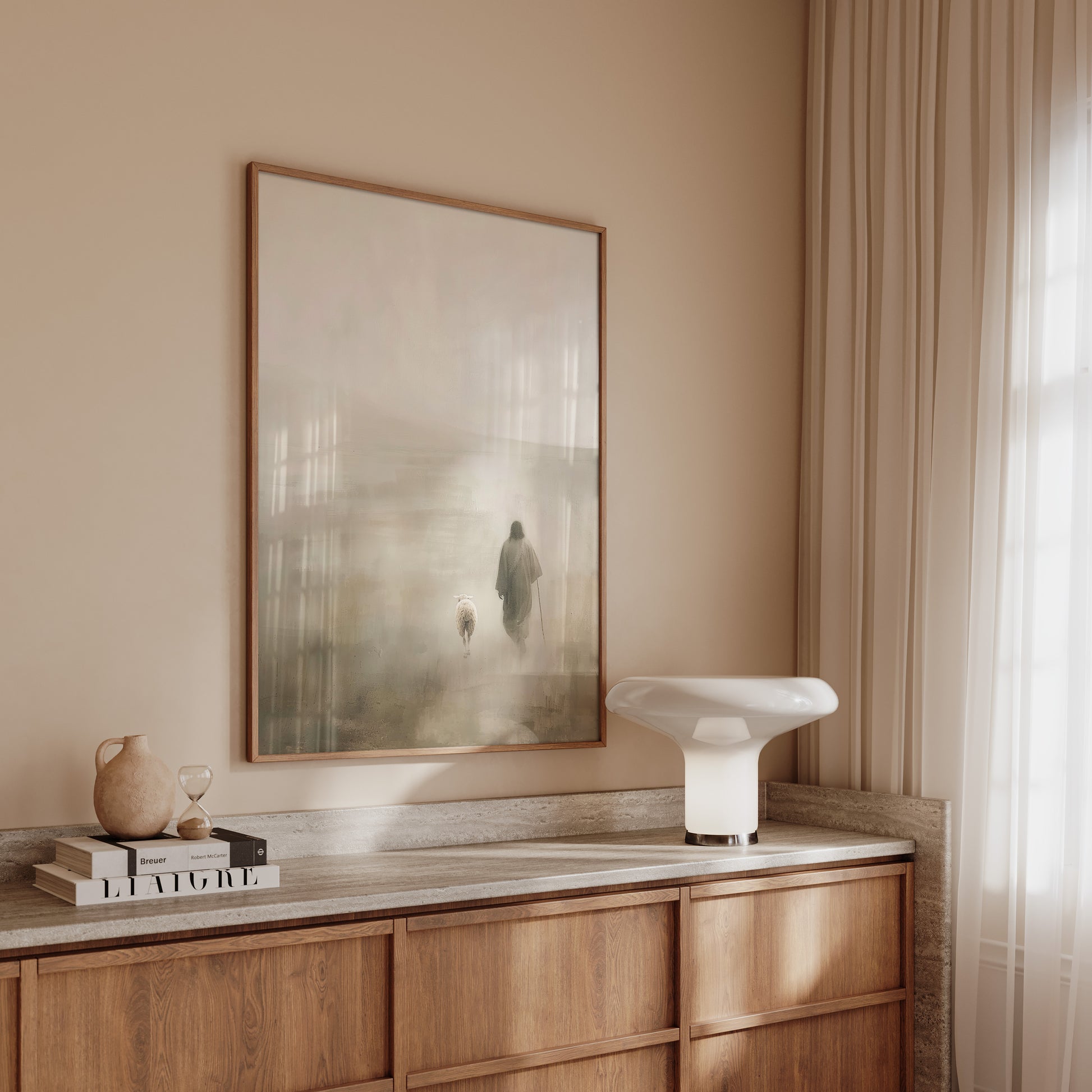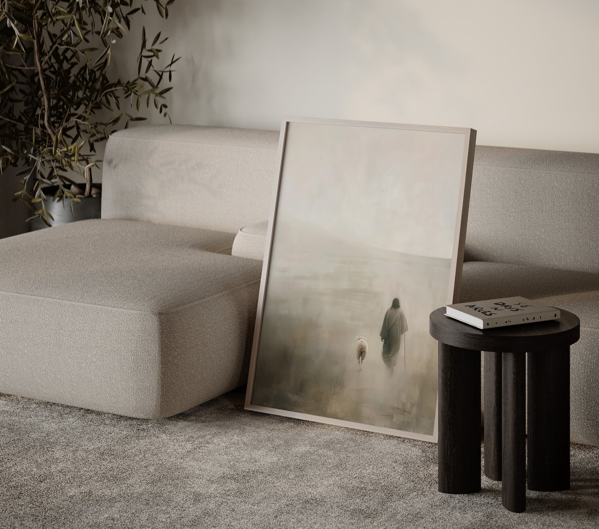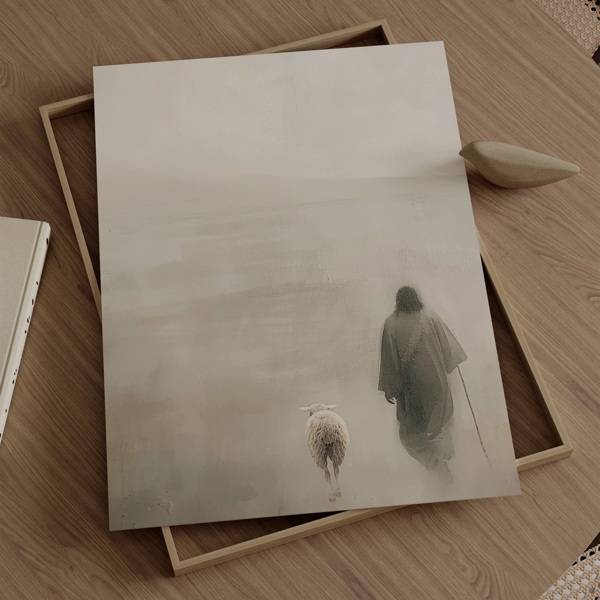 The Shepherd’s Love is a moving portrait of Jesus walking tenderly beside a sheep—an image of His unfailing pursuit and care. Inspired by the parable of the lost sheep, this artwork reminds us of a Savior who never stops seeking, leaving the ninety-nine to bring home the one.