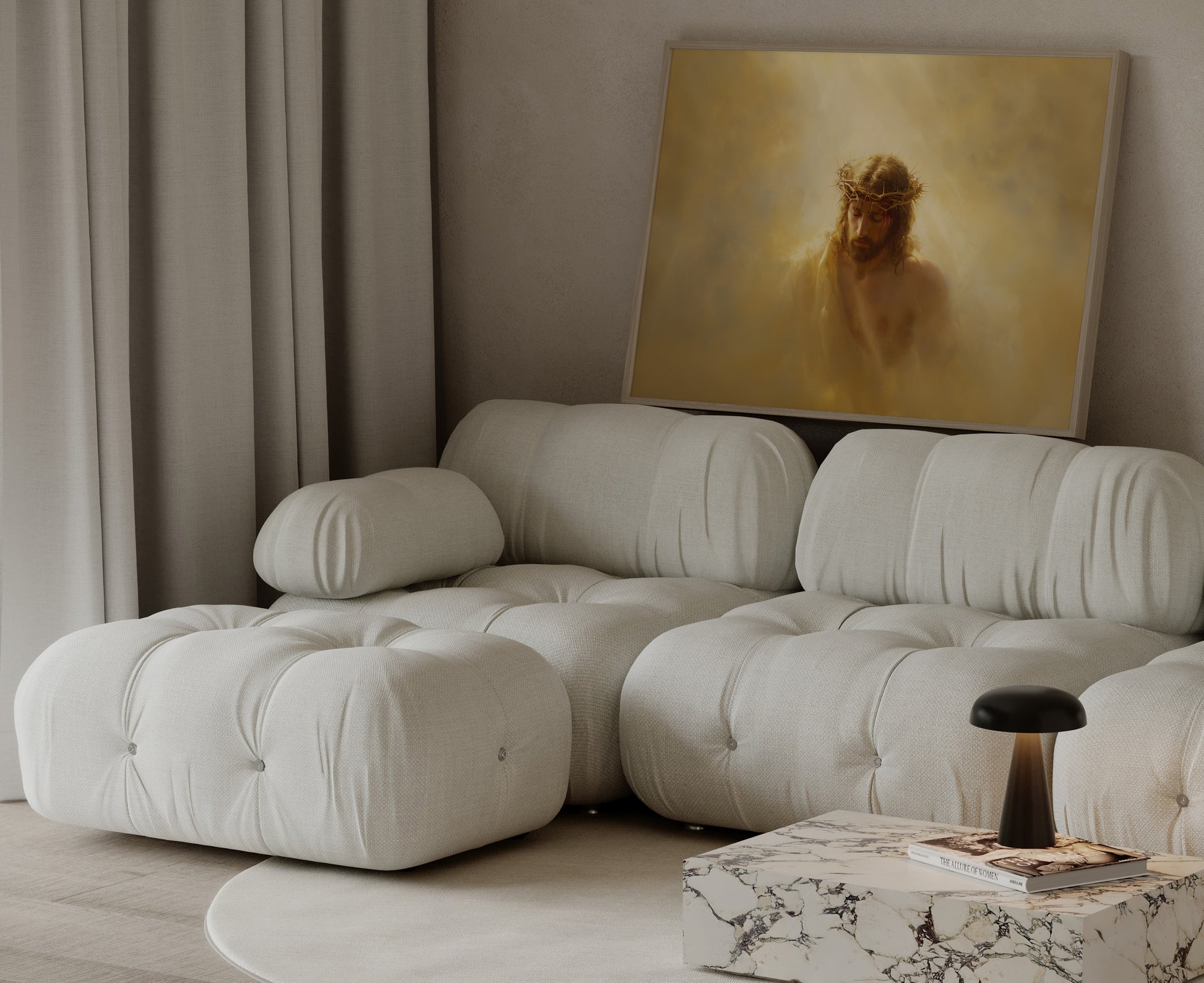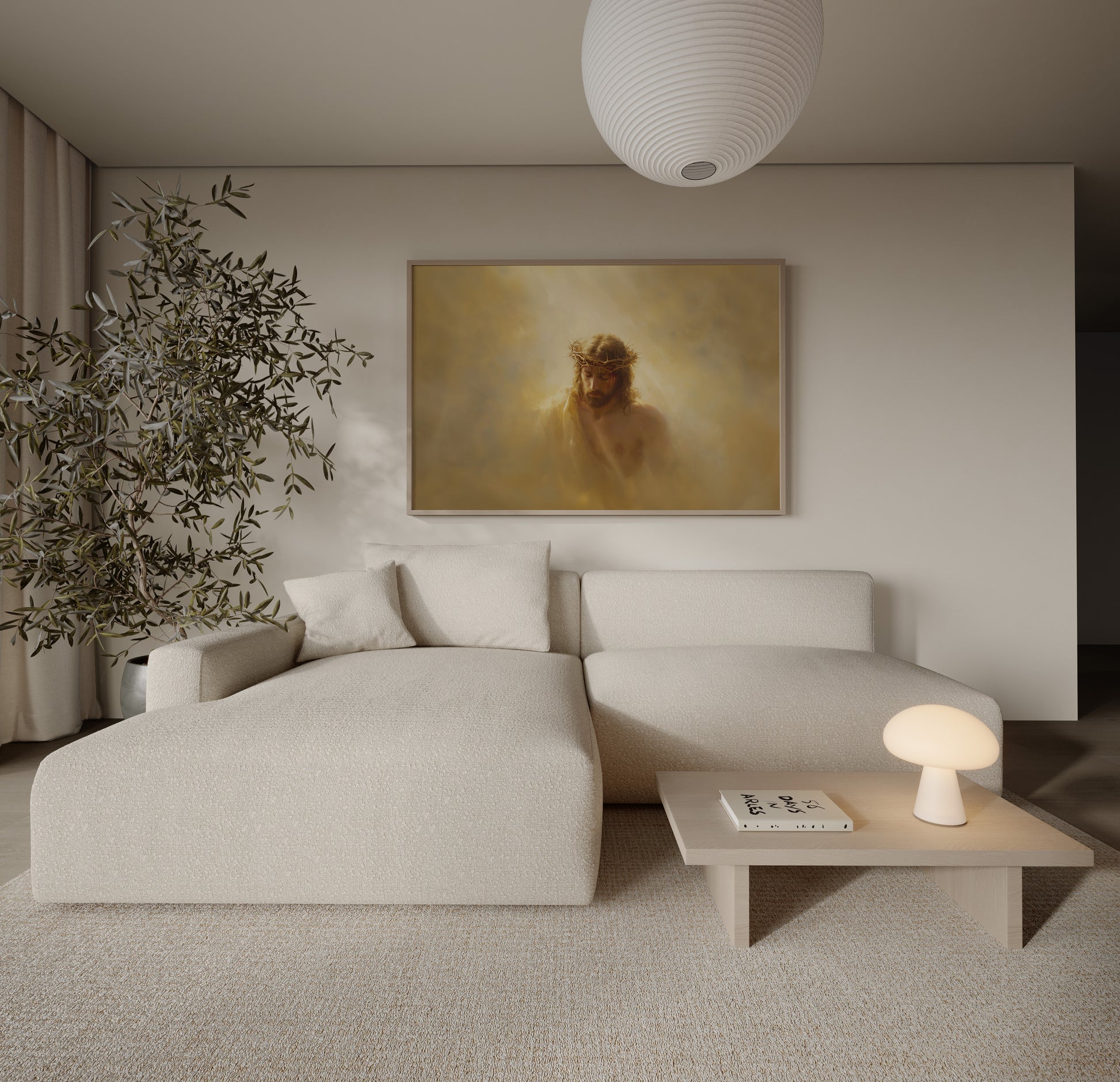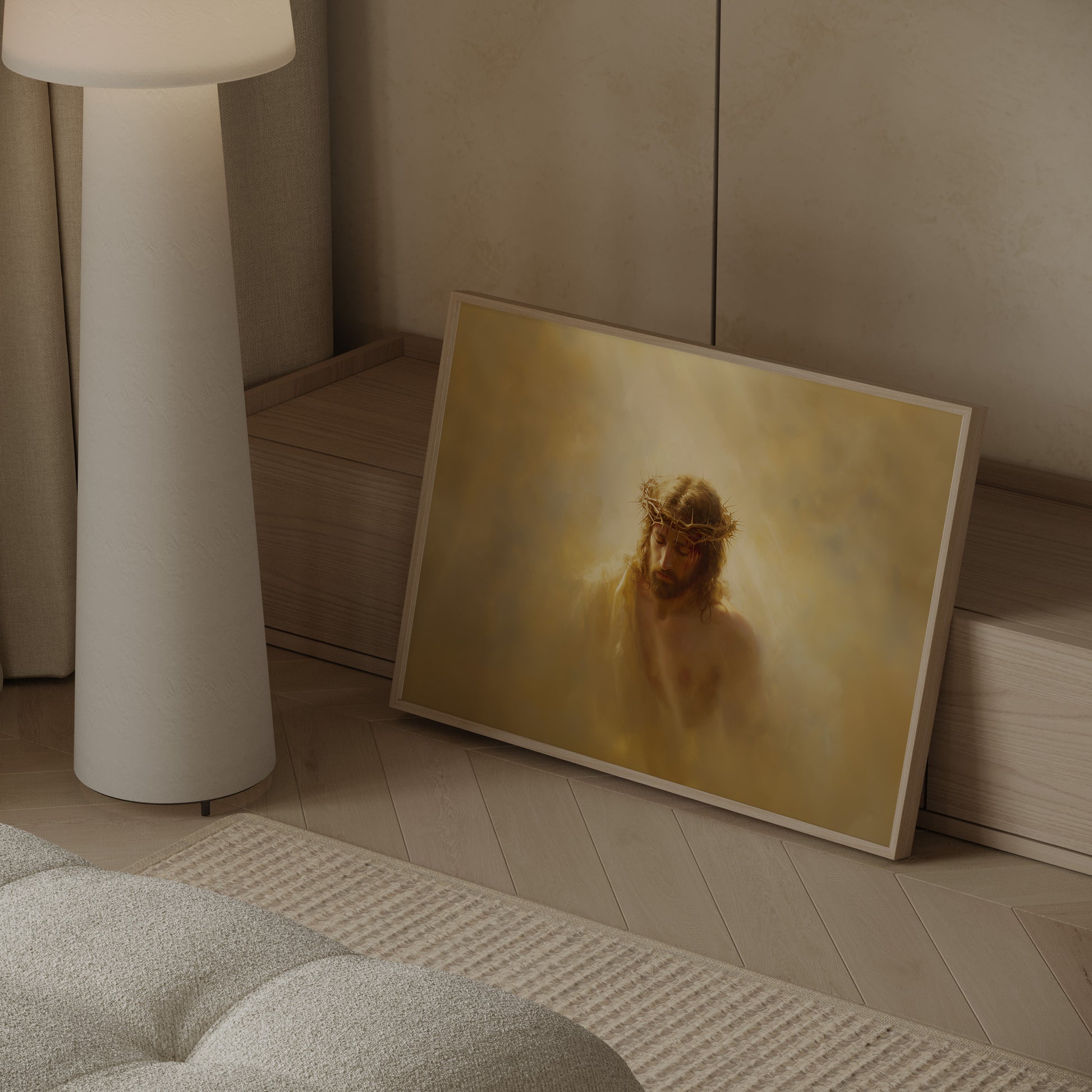 The Weight of Love depicts Jesus wearing the crown of thorns, His head bowed and eyes cast downward, bathed in a warm golden light. This artwork captures His sorrow, humility, and the immense love He bore for humanity.