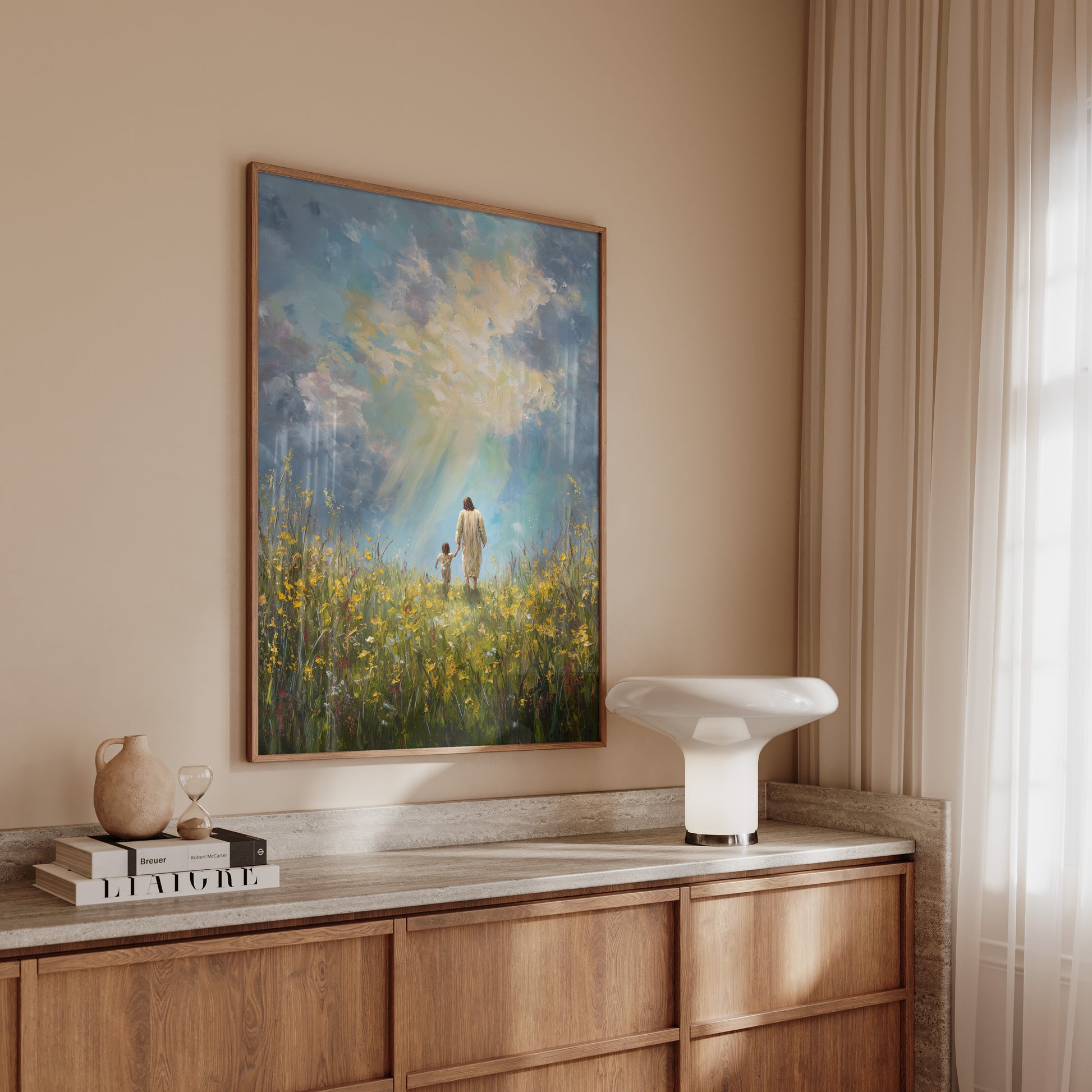 Walking in His Light shows Jesus holding a child’s hand as they stroll through a peaceful meadow, surrounded by nature’s beauty. The scene symbolizes guidance, protection, and the gentle love of Christ on life’s journey.
